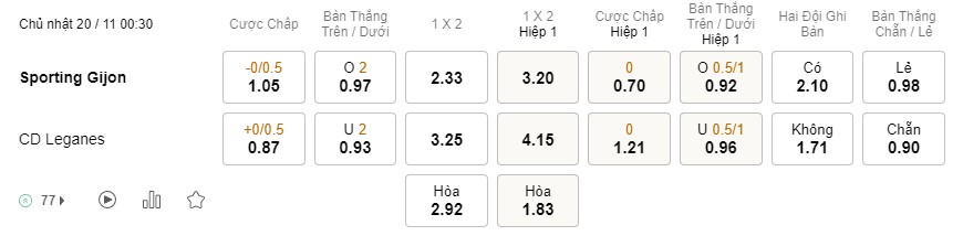 Soi kèo hiệp 1 Gijon vs Leganes: 0.70*0*1.21