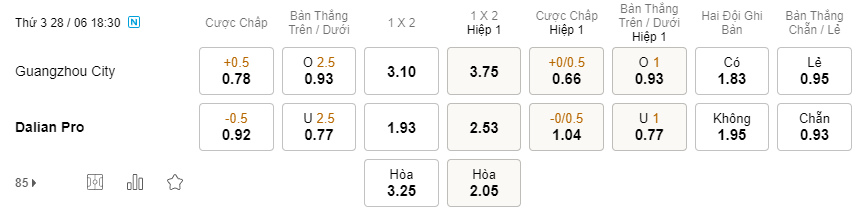 Tỉ lệ kèo Guangzhou City vs Dalian Pro