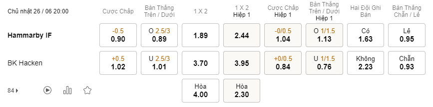 Soi kèo hiệp 1 Hammarby vs Hacken: 1.04*0/0.5*0.84