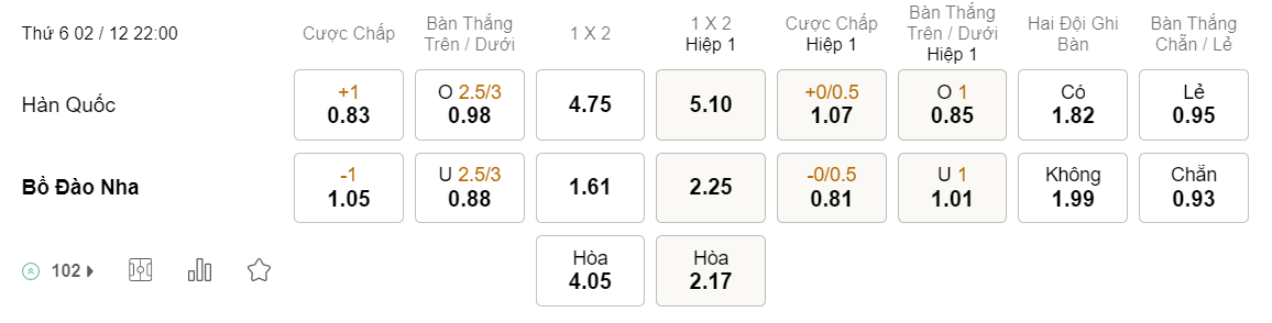 Tỉ lệ kèo Hàn Quốc vs Bồ Đào Nha