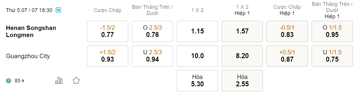Tỉ lệ kèo Henan vs Guangzhou City