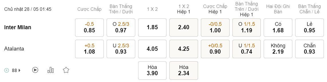 Tỉ lệ kèo Inter vs Atalanta