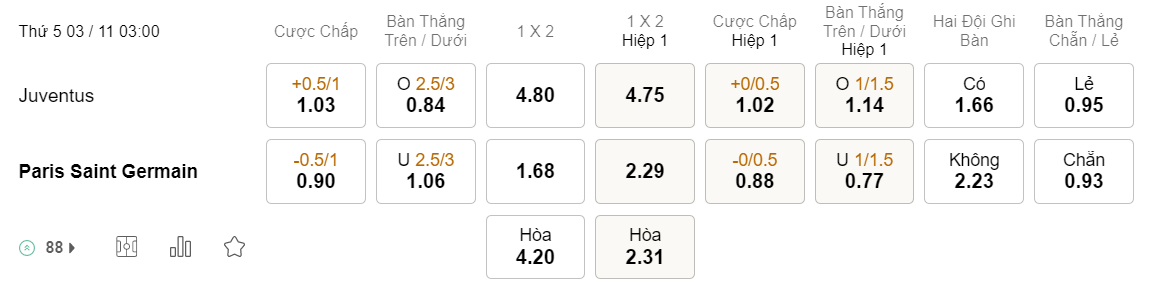 Soi kèo hiệp 1 Juventus vs PSG: 1.02*0/0.5*0.88