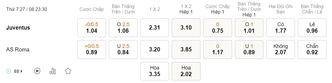 Soi kèo hiệp 1 Juventus vs Roma: 0.75*0*1.17