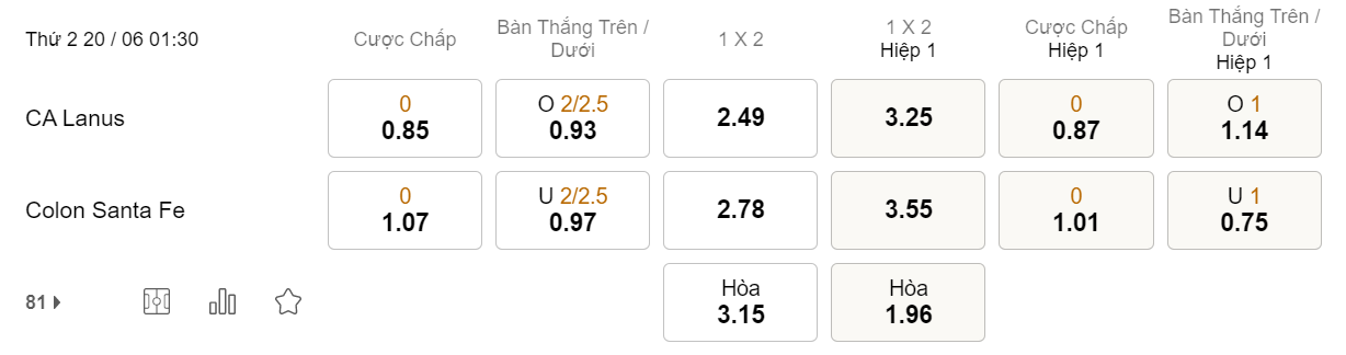 Soi kèo châu Á Lanus vs Colon: 0.85*0*1.07