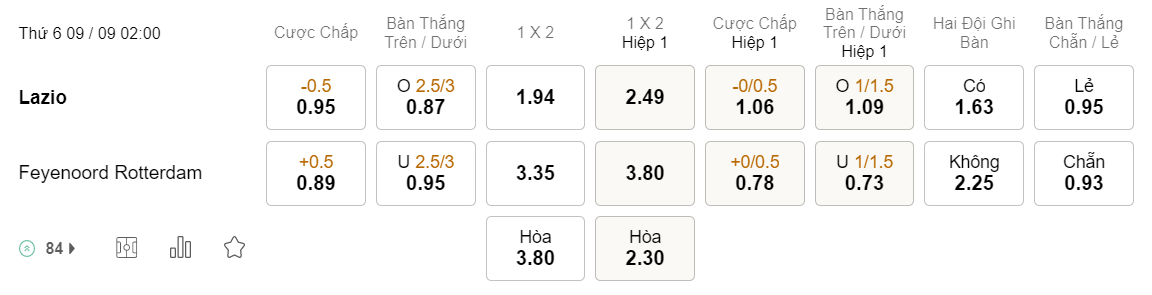 Tỉ lệ kèo Lazio vs Feyenoord