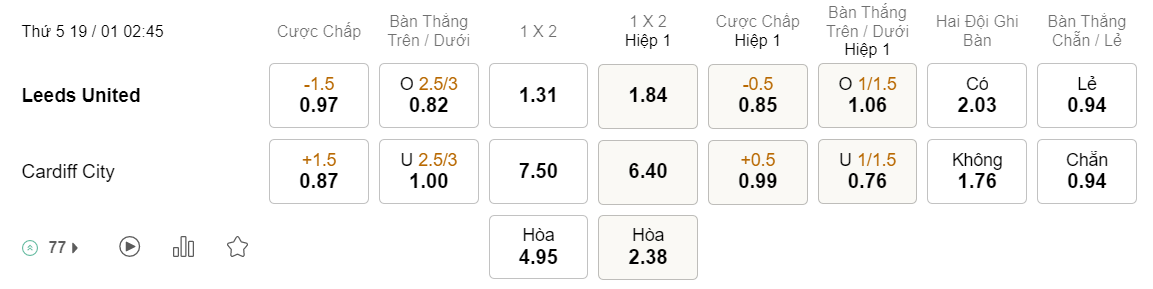 Soi kèo tài xỉu Leeds vs Cardiff: 0.82*2.5/3*1.00