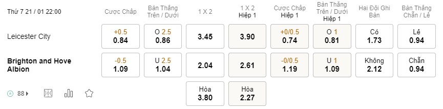 Soi kèo châu Á Leicester vs Brighton: 0.84*0.5*1.09
