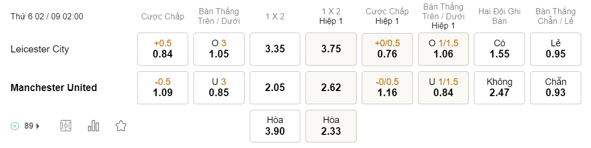 Soi kèo châu Á Leicester vs MU: 0.84*0.5*1.09