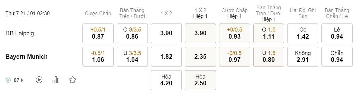 Soi kèo châu Á Leipzig vs Bayern: 0.87*0.5/1*1.06