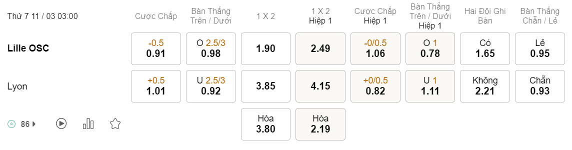 Tỉ lệ kèo Lille vs Lyon