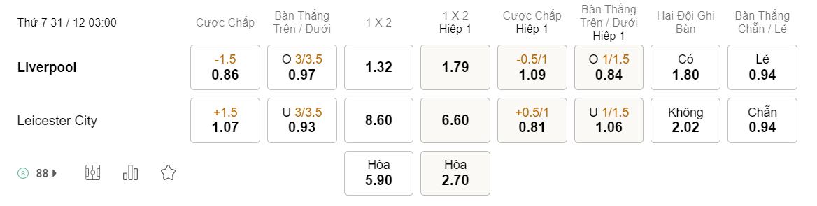 Tỉ lệ kèo Liverpool vs Leicester