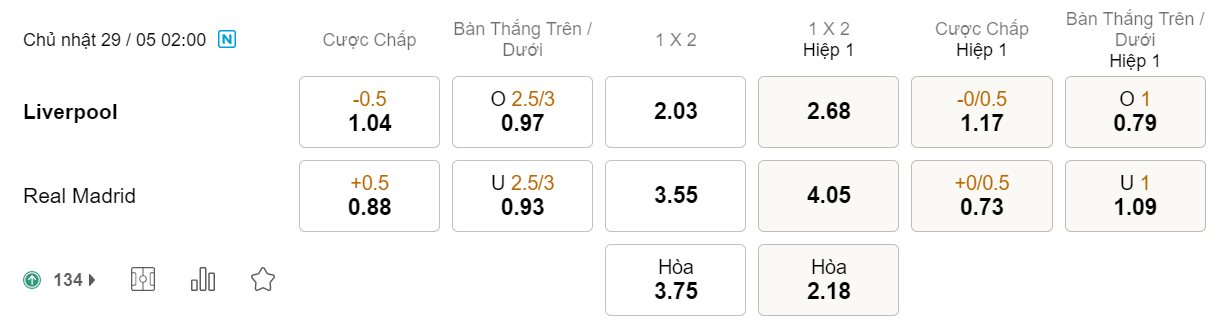 Soi kèo hiệp 1 Liverpool vs Real Madrid: 1.17*0/0.5*0.73
