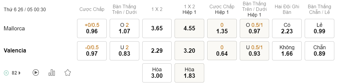 Tỉ lệ kèo Mallorca vs Valencia