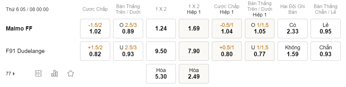 Soi kèo hiệp 1 Malmo vs Dudelange: 1.05*1/1.5*0.77