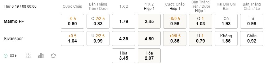Soi kèo tài xỉu Malmo vs Sivasspor: 0.83*2/2.5*0.99