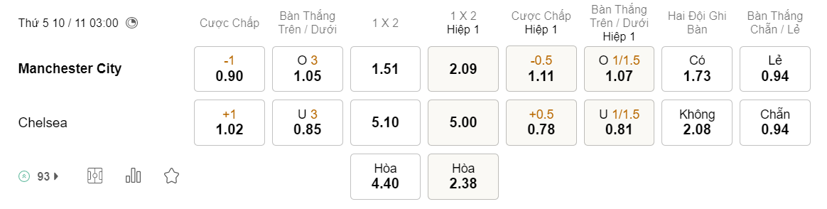 Soi kèo hiệp 1 Man City vs Chelsea: 1.11*0.5*0.78