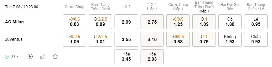 Soi kèo châu Á Milan vs Juventus: 0.83*0/0.5*1.09