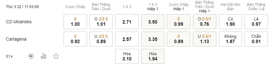 Thống kê cho thấy, Mirandes đối đầu Cartagena luôn mang tới những trận đấu có nhịp độ cao và vô cùng phóng khoáng. Theo đó, có tới 4/5 lần gần nhất 2 đội đối đầu nhau, NHM đã được chứng kiến ít nhất 3 bàn thắng xuất hiện mỗi 90 phút. Đó là lý do một số trang truc tiep bong da hd nhận định tỉ lệ nổ Tài sẽ là khá cao trong trận đấu này.