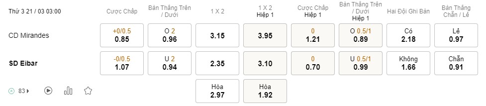 Soi kèo hiệp 1 Mirandes vs Eibar: 1.21*0*0.70