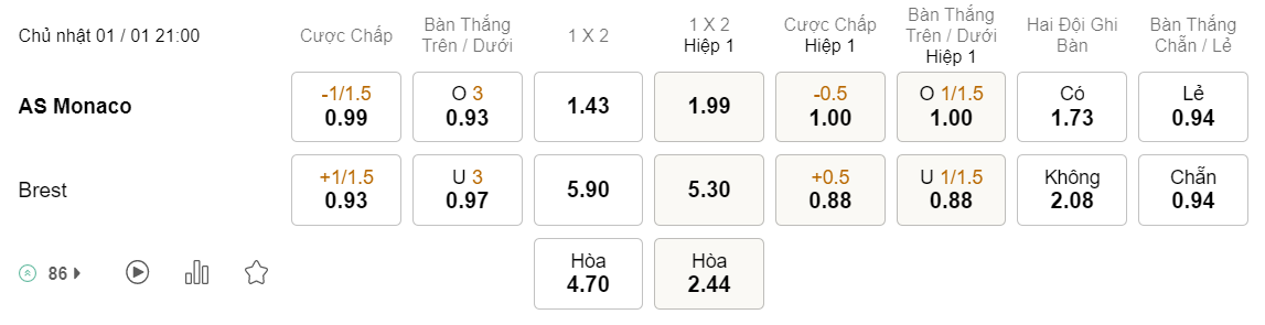 Theo thống kê, lần gần nhất Monaco đối đầu Brest, NHM đã được chứng kiến tổng cộng tới 6 bàn thắng được ghi. Vì vậy các chuyên gia của Vebo TV nhận định tỉ lệ nổ Tài sẽ là cao hơn ở cặp đấu này.