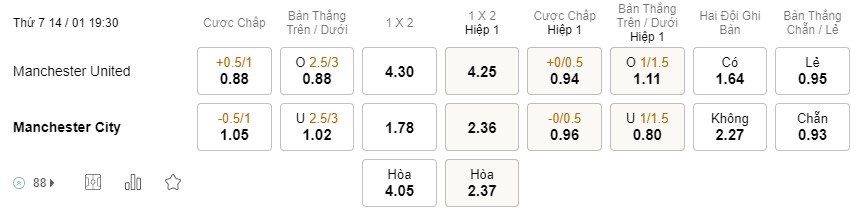 Soi kèo châu Á MU vs Man City: 0.88*0.5/1*1.05