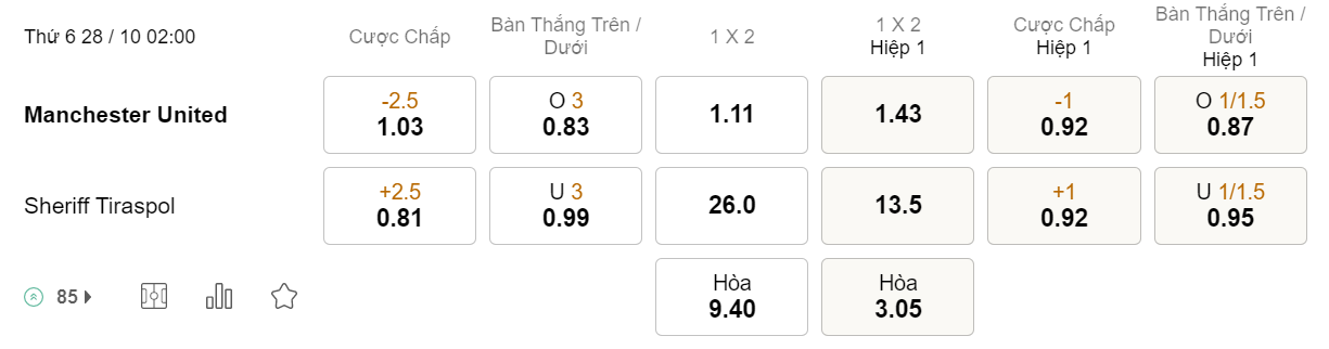 Soi kèo tài xỉu MU vs Sheriff: 0.83*3*0.99