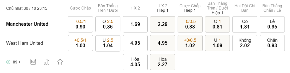 Tỉ lệ kèo MU vs West Ham