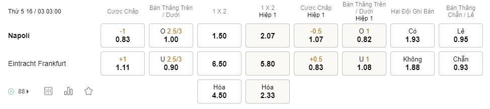 Tỉ lệ kèo Napoli vs Frankfurt