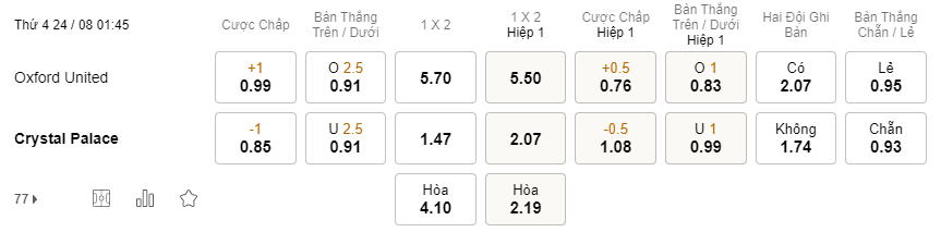 Tỉ lệ kèo Oxford vs Crystal Palace