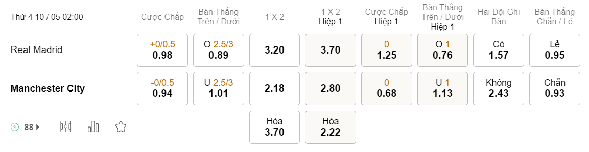 Soi kèo châu Á Real Madrid vs Man City: 0.98*0/0.5*0.94
