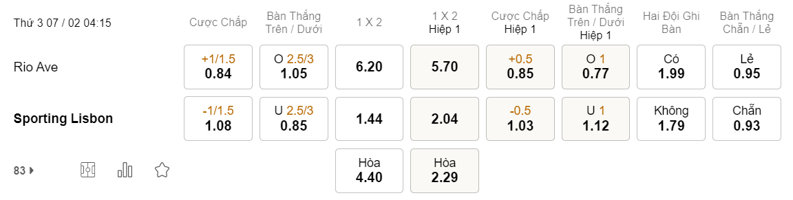 Tỉ lệ kèo Rio Ave vs Sporting Lisbon