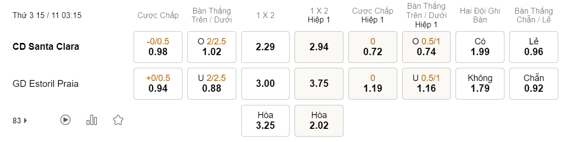 Soi kèo tài xỉu Santa Clara vs Estoril: 1.02*2/2.5*0.88