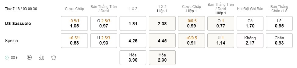 Tỉ lệ kèo Sassuolo vs Spezia