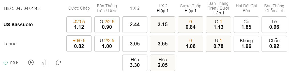 Tỉ lệ kèo Sassuolo vs Torino