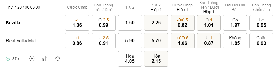 Tỉ lệ kèo Sevilla vs Valladolid