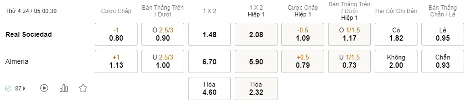 Soi kèo hiệp 1 Sociedad vs Almeria: 1.09*0.5*0.79