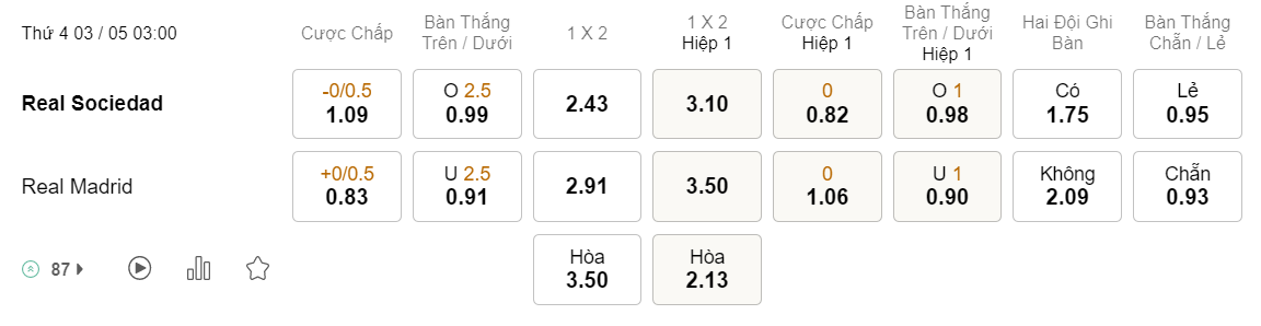 Tỉ lệ kèo Sociedad vs Real Madrid