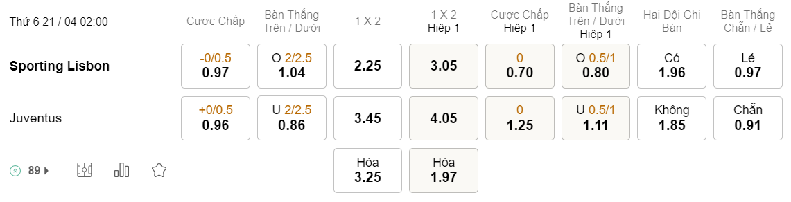Tỉ lệ kèo Sporting Lisbon vs Juventus