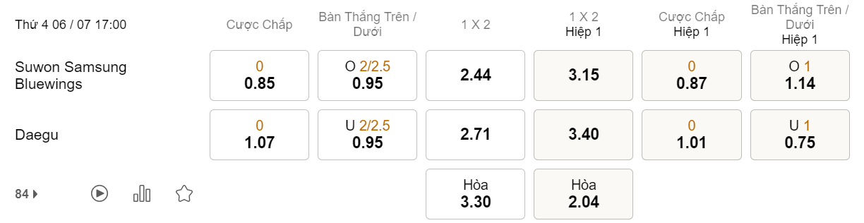 Soi kèo châu Á Suwon Bluewings vs Daegu: 0.85*0*1.07