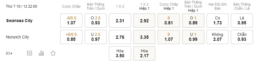 Soi kèo hiệp 1 Swansea vs Norwich: 0.81*0*1.07