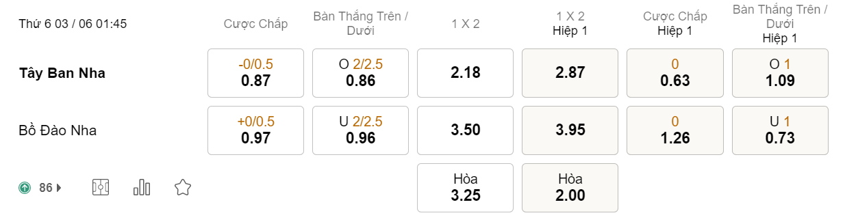 Tỉ lệ kèo Tây Ban Nha vs Bồ Đào Nha