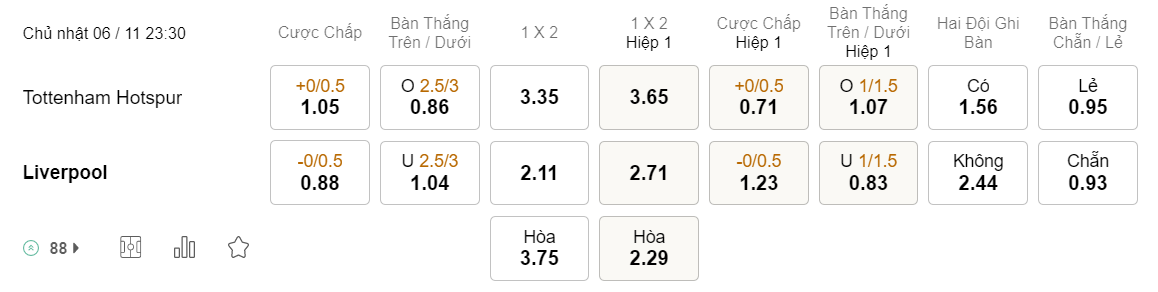 Soi kèo hiệp 1 Tottenham vs Liverpool: 0.71*0/0.5*1.23