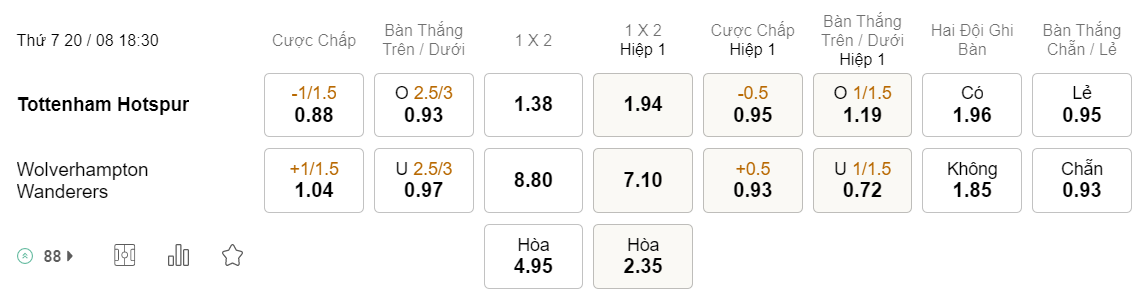 Tỉ lệ kèo Tottenham vs Wolves