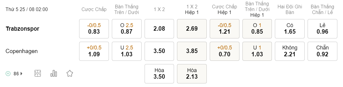 Tỉ lệ kèo Trabzonspor vs Copenhagen