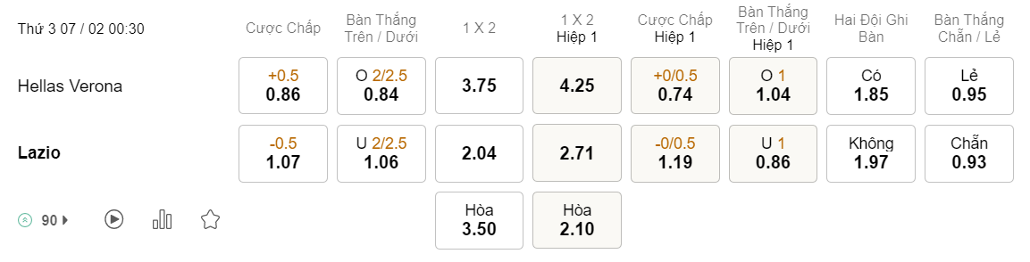 Soi kèo hiệp 1 Verona vs Lazio: 0.74*0/0.5*1.19
