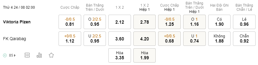Soi kèo châu Á Viktoria Plzen vs Qarabag: 0.81*0/0.5*1.12