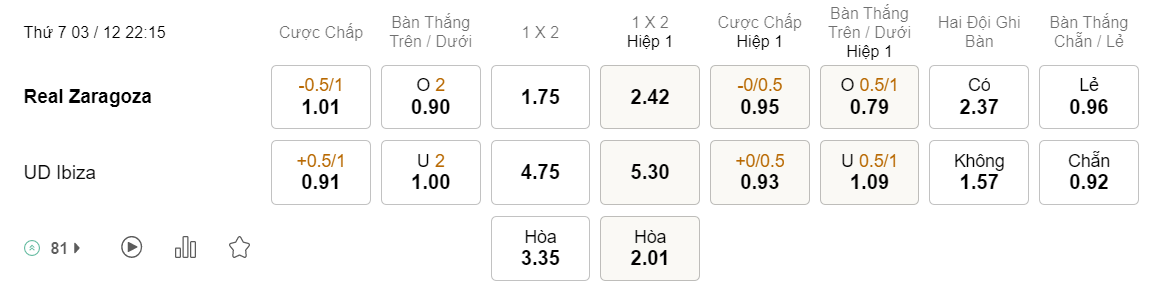 Tỉ lệ kèo Zaragoza vs Ibiza